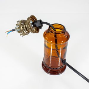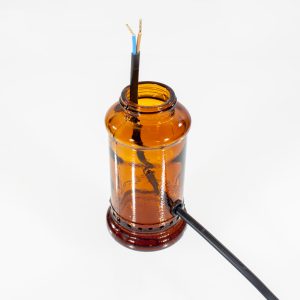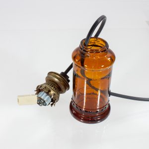 The concept around this lamp is the cable begin drilled through the glass bottle and up into a G9 Halogen lampholder using an LED lamp.