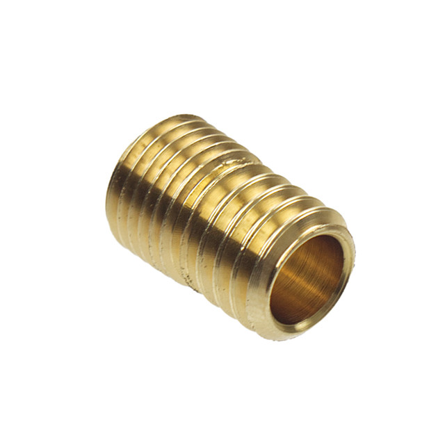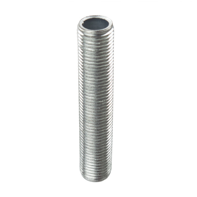 This wood nipple has a fine thread in one end to screw into the lampholder and a coarse thread in the other to fix into the wood.