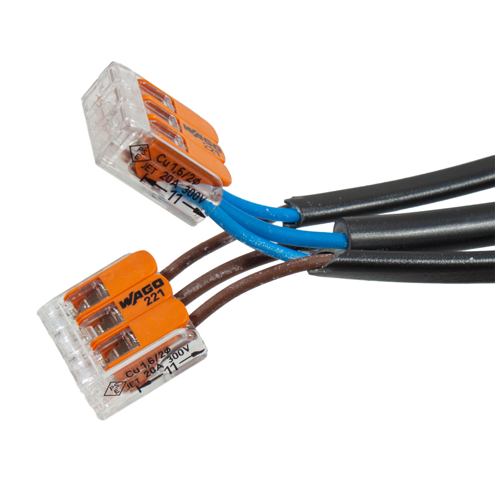 Take all 3 pieces and strip the ends so they are all the same, then using Wagos connect all the browns together and all the blues together.