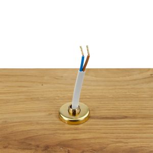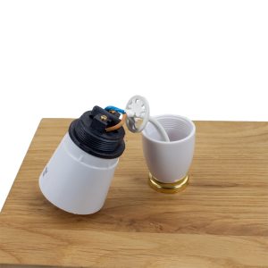 This is a guide to help you install our Wooden Lampholder Kit With Backplate, and I am using some prop parts which already have a hole and the backplate fixed to a piece of wood.